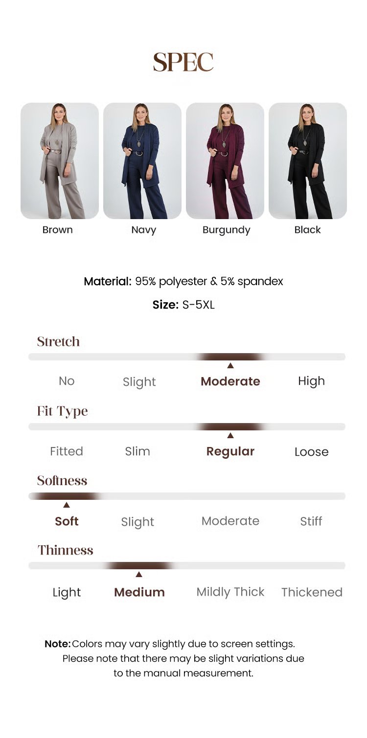 • [Inclusive Fit] Designed with a relaxed silhouette, the Elegant Longline Cardigan & Top and Pants 3-Pieces Set perfectly accommodates various body shapes, promoting confidence and freedom of movement. Enjoy a comfortable fit that highlights your natural curves.