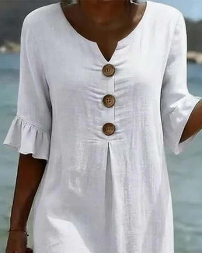 This dress combines the freshness of cotton with the lightness of linen, creating the perfect garment for warm days. Its loose fit allows for a natural drape that flatters the silhouette without clinging, offering all-day comfort. The front buttons add a casual yet elegant touch, ideal for relaxed summer looks.A decorative detail that brings a simple and modern style. Easy to wear and pairs well with any outfit.Lightweight sleeves that add a feminine touch. They allow freedom of movement and excellent breathability.Ideal fabric for hot climates and daily wear. Keeps you feeling fresh all day long.Perfect for vacations, strolls, or everyday use. Easily styled with sandals or accessories.A clean design that never goes out of style. Ideal for a natural, comfortable, and elegant look.